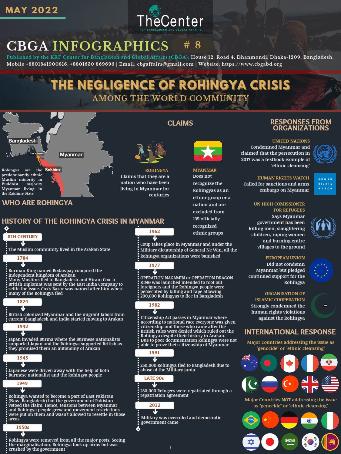 CBGA Infographics 8: The Negligence of Rohingya Crisis Among the World Community By The KRF Center for Bangladesh and Global Affairs - Tuesday, June 7, 2022 675 CBGA Presents you the 8th Infograph, The Negligence of Rohingya Crisis Among the World Community.