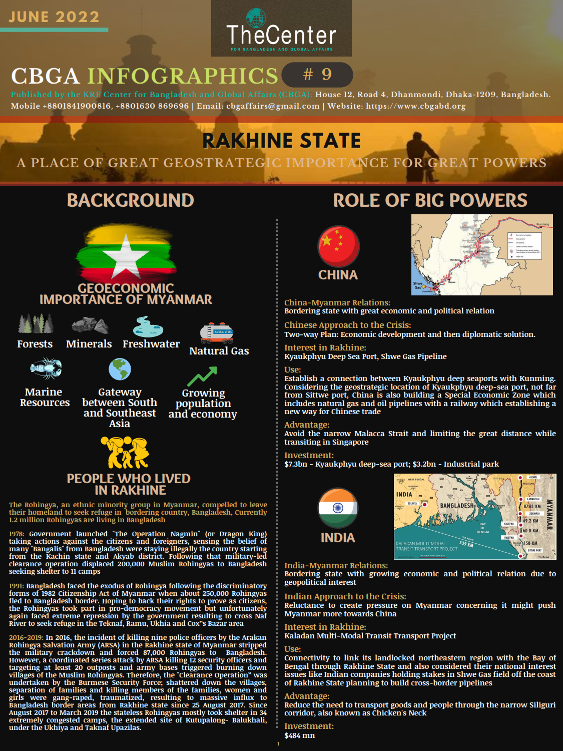 CBGA Infographics 9: Rakhine State: A Place of Great Geostrategic Importance for Great Powers. By The KRF Center for Bangladesh and Global Affairs - Tuesday, June 14, 2022 283 CBGA Presents you the 9th Infograph, Rakhine State: A Place of Great Geostrategic Importance for Great Powers.