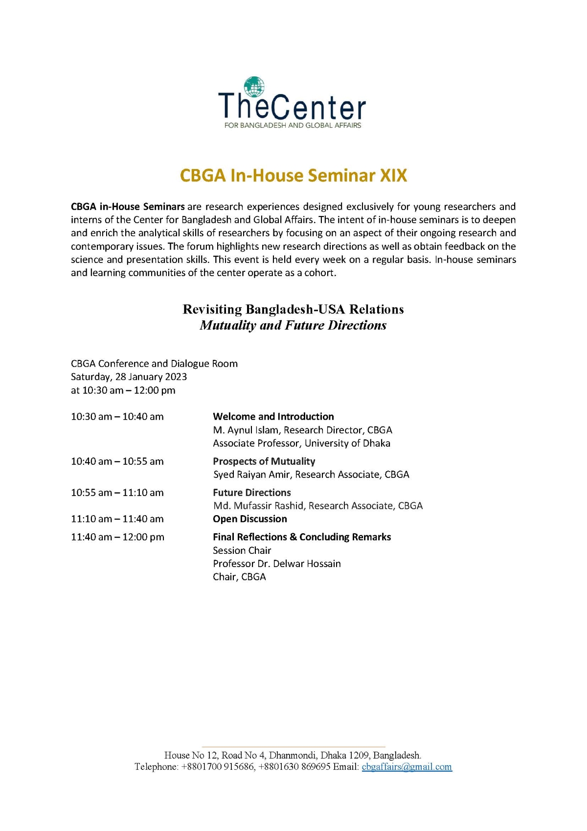 The KRF Center for Bangladesh and Global Affairs (CBGA) is going to organize a Seminar on Revisiting Bangladesh-USA Relations: Mutuality and Future Directions on Saturday, 28 January 2023 at 10:30 am at the CBGA Dialogue & Conference Room. Syed Raiyan Amir (Research Associate, CBGA), and Md. Mufassir Rashid (Research Associate, CBGA) are the Speakers of the Seminar. Professor Dr. Delwar Hossain, Chair (Honorary), CBGA will preside over the Seminar. M. Aynul Islam, Research Director, CBGA and Associate Professor of the University of Dhaka will moderate the session.