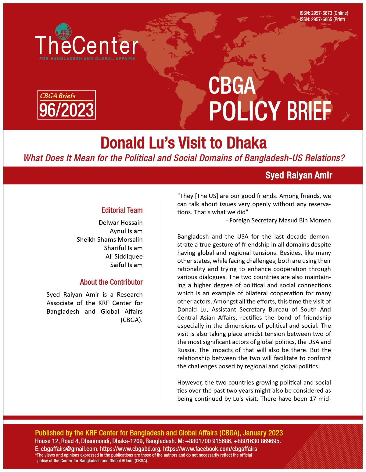 Bangladesh and the USA for the last decade demonstrate a true gesture of friendship in all domains despite having global and regional tensions. Besides, like many other states, while facing challenges, both are using their rationality and trying to enhance cooperation through various dialogues. The two countries are also maintaining a higher degree of political and social connections which is an example of bilateral cooperation for many other actors. Amongst all the efforts, this time the visit of Donald Lu, Assistant Secretary Bureau of South And Central Asian Affairs, rectifies the bond of friendship especially in the dimensions of political and social. The visit is also taking place amidst tension between two of the most significant actors of global politics, the USA and Russia. The impacts of that will also be there. But the relationship between the two will facilitate to confront the challenges posed by regional and global politics.