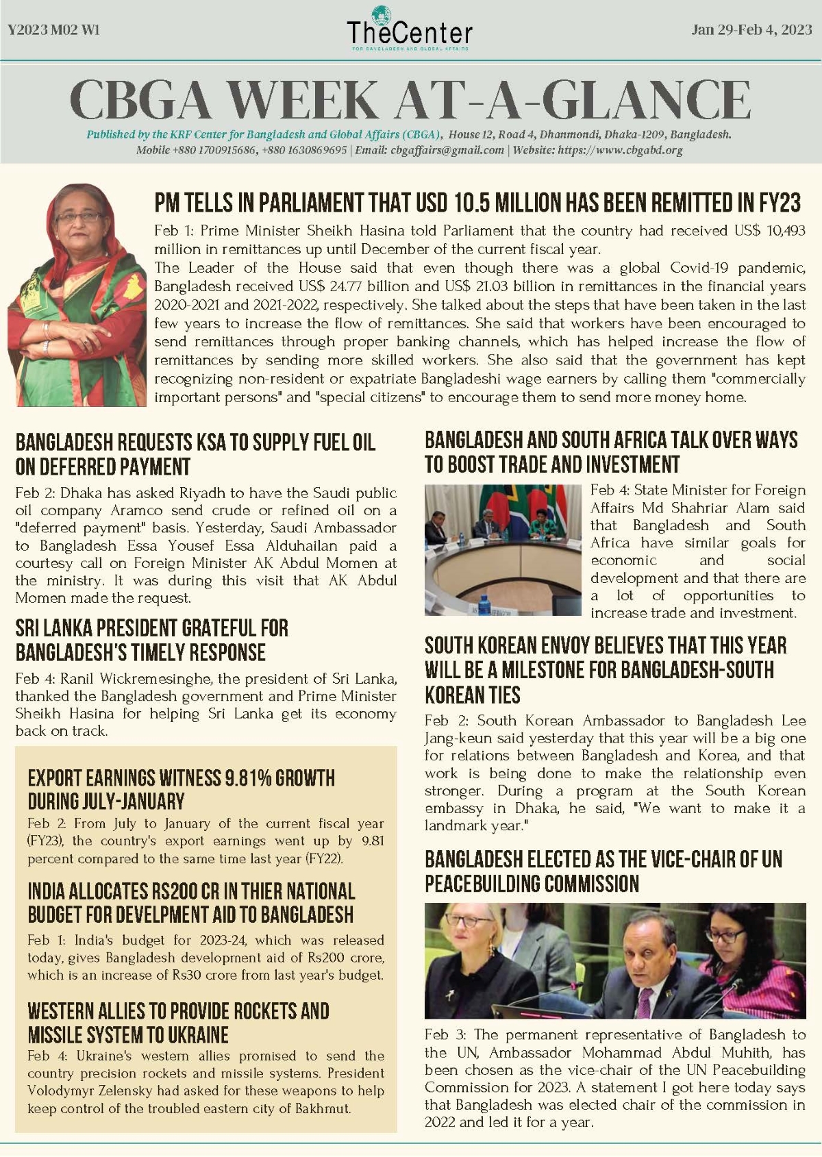 CBGA Week At-A-Glance 05, January 29 – February 04 2023 By The KRF Center for Bangladesh and Global Affairs - Wednesday, February 15, 2023 294 CBGA has published its 5th Week At-A-Glance. [Read Full As a Pdf]