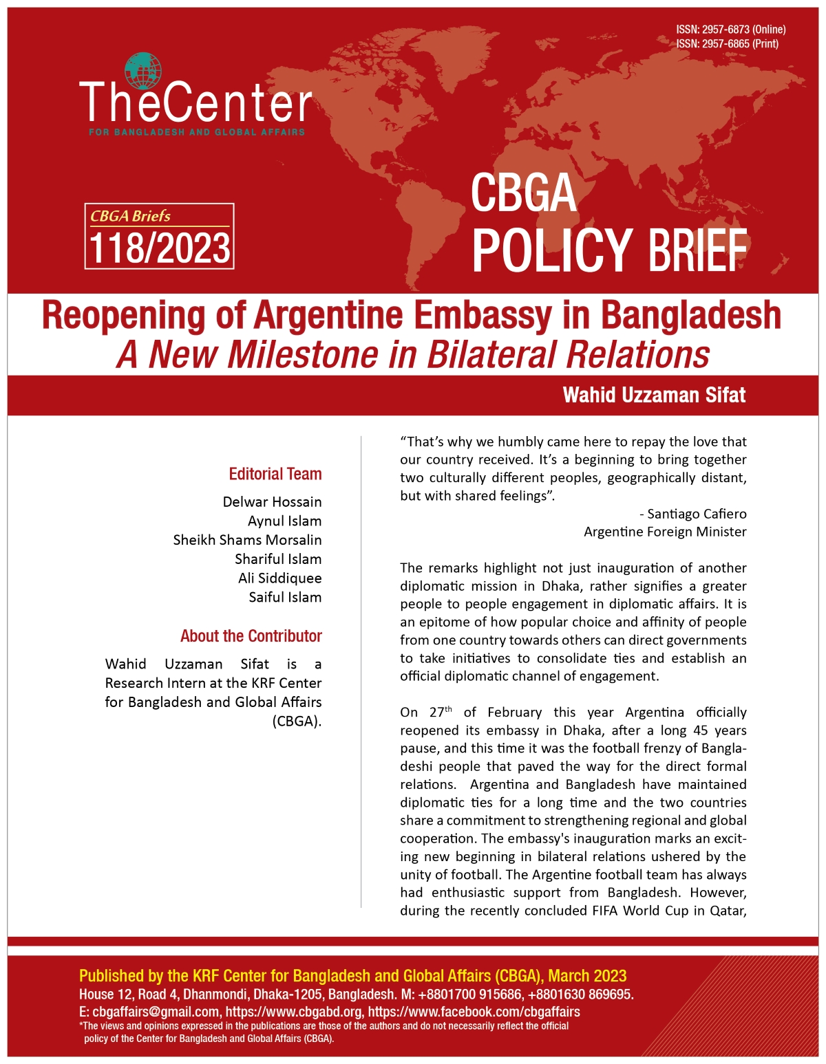 It is anticipated that the opening of an embassy in Dhaka will promote more economic and investment cooperation between the two nations. In addition, Bangladesh made considerable improvements to its infrastructure and is creating 100 specialized economic zones to draw in foreign investment, something Argentina may consider. Additionally, with Argentina on its side Bangladesh can strongly be vocal about its inclusion in the MERCOSUR, the largest free market and economic and political bloc in South America. Perhaps the most significant outcome of the reinforced relationship would be football cooperation for Bangladesh, where Argentina will provide training and technical support to Bangladeshi coaches and young footballers to develop the quality of football in Bangladesh. During Cafiero’s visit, a memorandum of understanding between the foreign service academies in the field of diplomatic training, an agreement to facilitate football training and cooperation, and a visa exemption agreement for diplomatic and official passport holders were signed signaling a robust engagement in the future.