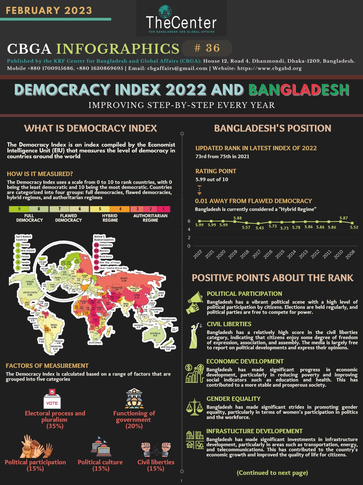CBGA Infographics 36: Democracy Index 2022 and Bangladesh: Improving Step-By-Step Every Year By The KRF Center for Bangladesh and Global Affairs - Friday, March 24, 2023 316 CBGA presents you the 36th Infograph: Click for full Democracy Index 2022 and Bangladesh: Improving Step-By-Step Every Year