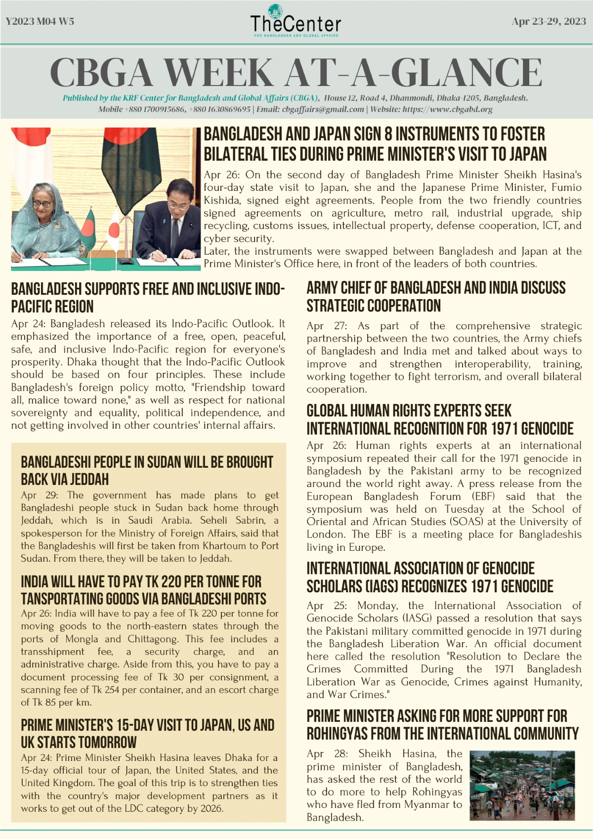 CBGA Week At-A-Glance 16, April 23-29, 2023 By The KRF Center for Bangladesh and Global Affairs - Wednesday, May 3, 2023 303 CBGA has published its 16th Week At-A-Glance. [Read Full as a Pdf]