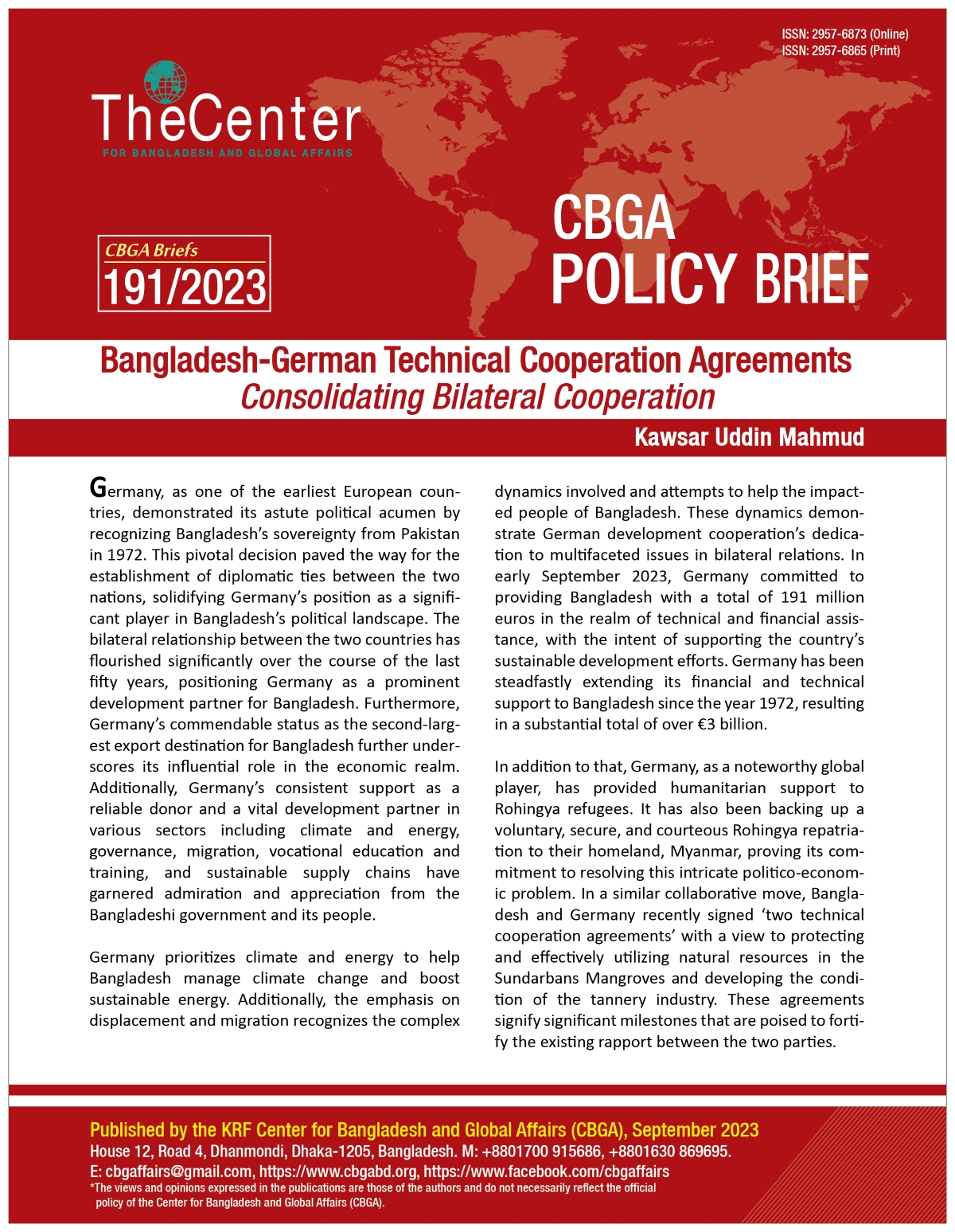 However, on the whole, the German-Bangladesh bilateral rapport and development cooperation has a sound track record of ensuring well-being in various areas such as mitigation and adaptation to climate change, infrastructure development, poverty reduction, promotion of good governance, renewable energy transition, support for the Rohingya and host communities as well as underscoring the repatriation of the displaced people. Additionally, the recent focus on initiatives related to Sundarbans management, marine environment protection, and the tannery and leather industry also marks a positive trend in the bilateral relationship. By safeguarding and preserving the invaluable natural resources of Sundarbans and enhancing industrial practices to the competitive advantage and market accessibility of the strategically significant leather sector, particularly in relation to European markets characterized by stringent labor requirements, the recent agreements, without any doubt, would signify the ongoing success of bilateral cooperation and will play a role in the attainment of the SDGs, climate goals, and other strategic interests in both sides.
