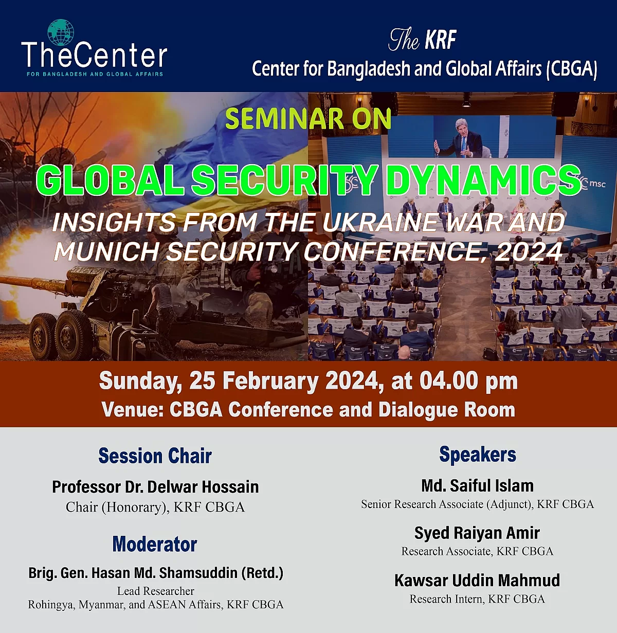 The KRF Center for Bangladesh and Global Affairs (CBGA) organized a Seminar on “Global Security Dynamics: Insights from the Ukraine War and Munich Security Conference, 2024″ on Sunday, 25 February 2024 at 04.00 pm at the CBGA Conference & Dialogue Room. Md. Saiful Islam (Senior Research Associate (Adjunct), KRF CBGA), Syed Raiyan Amir (Research Associate, KRF CBGA), and Kawsar Uddin Mahmud (Research Intern, KRF CBGA) are the Speakers of the Seminar. Professor Dr. Delwar Hossain, Chair (Honorary), KRF CBGA presided over the Seminar. Brig. Gen. Hasan Md. Shamsuddin (Retd.), ndc, afwc, psc, MPhil, Lead Researcher, Rohingya, Myanmar and ASEAN Affairs, KRF CBGA moderated the session.