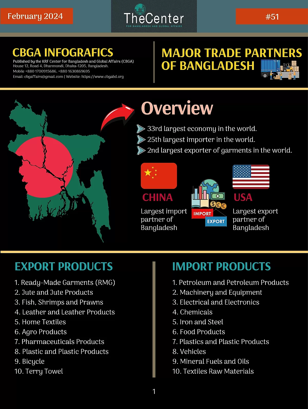 CBGA Infographics 51: Major Trade Partners of Bangladesh By The KRF Center for Bangladesh and Global Affairs - Tuesday, February 27, 2024 507 CBGA presents you the 51st Infograph: Click for full Major Trade Partners of Bangladesh