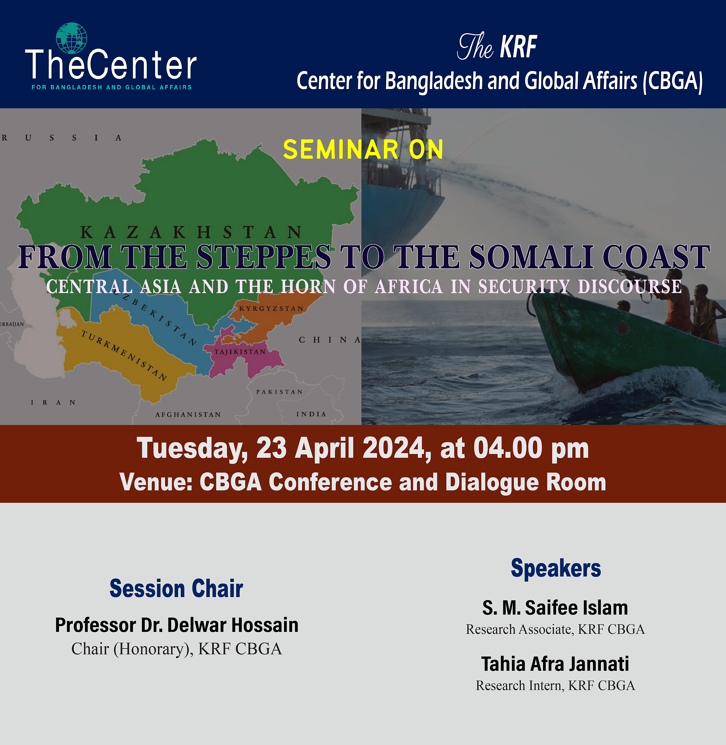 The KRF Center for Bangladesh and Global Affairs (CBGA) organized a Seminar on “From the Steppes to the Somali Coast: Central Asia and the Horn of Africa in Security Discourse“ on Tuesday, 23 April 2024 at 04.00 pm at the CBGA Conference & Dialogue Room. S. M. Saifee Islam (Research Associate, KRF CBGA) and Tahia Afra Jannati (Research Intern, KRF CBGA) are the Speakers of the Seminar. Professor Dr. Delwar Hossain, Chair (Honorary), KRF CBGA presided over the Seminar.