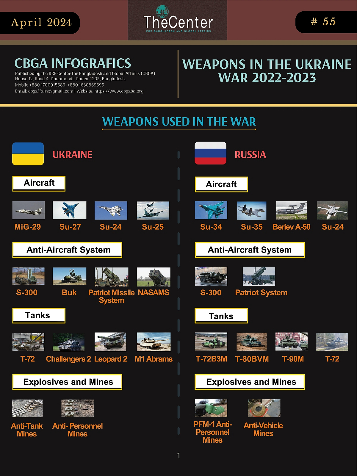 CBGA Infographics 55: Weapons in the Ukraine War 2022-2023 By The KRF Center for Bangladesh and Global Affairs - Monday, April 22, 2024 310 CBGA presents you the 55th Infograph: Click for full Weapons in the Ukraine War 2022-2023