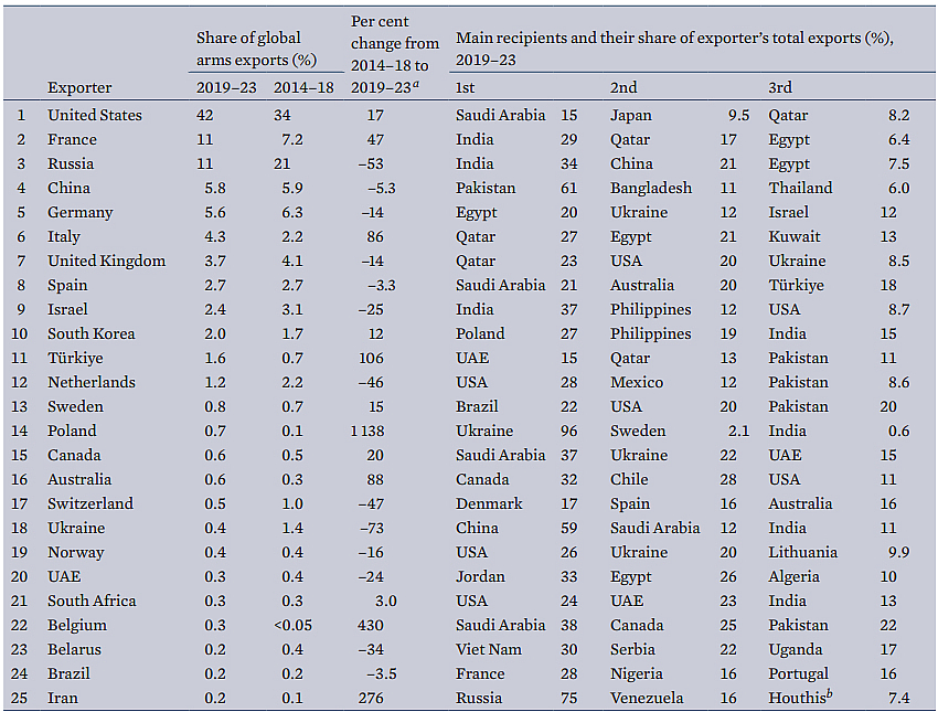 France’s proactive export policies, including government support, technological advancements, and strategic targeting of regions like the Middle East, fueled a rise in arms exports during the period. This positioned them to capitalize on Russia’s decline as a major exporter following the Ukraine war, allowing France to secure the number two spot with advanced weaponry like the Rafale fighter jet.