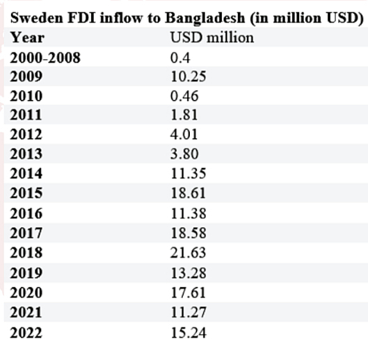 Foreign Direct Investment (FDI) from Sweden is also expected to rise further due to enhanced bilateral partnerships and a favorable business environment in Bangladesh. Over 50 Swedish companies are already operating in Bangladesh which includes H&M, Bikroy.com Limited, and Milvik Bangladesh Limited. From 2014 to 2018, Sweden’s FDI inflow to Bangladesh experienced a notable increase, suggesting a shift in the economic landscape. FDI grew from $11.35 million in 2014 to a peak of $21.63 million in 2018. Contributing factors to this growth may include economic stability, significant infrastructure development, and government incentives.