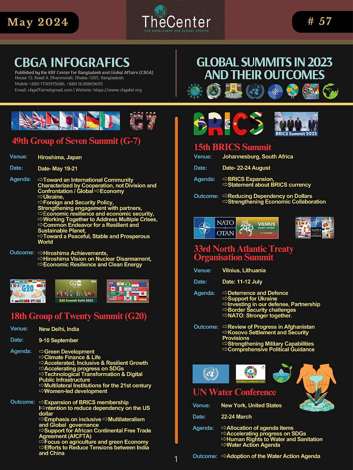CBGA Infographics 57: Global Summits in 2023 and Their Outcomes By The KRF Center for Bangladesh and Global Affairs - Saturday, May 18, 2024 240 CBGA presents you the 57th Infograph: Click for full Global Summits in 2023 and Their Outcomes
