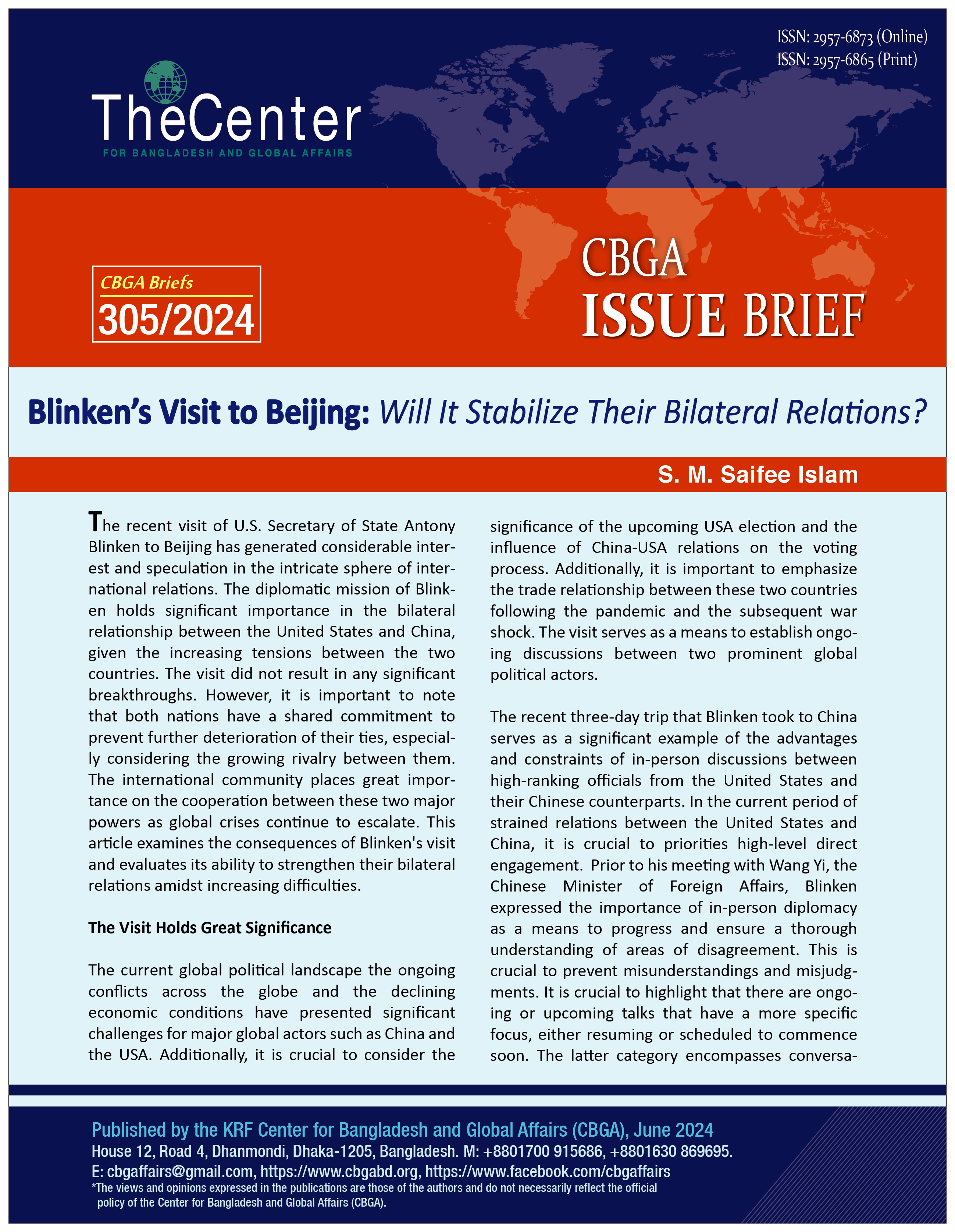 The current global political landscape the ongoing conflicts across the globe and the declining economic conditions have presented significant challenges for major global actors such as China and the USA. Additionally, it is crucial to consider the significance of the upcoming USA election and the influence of China-USA relations on the voting process. Additionally, it is important to emphasize the trade relationship between these two countries following the pandemic and the subsequent war shock. The visit serves as a means to establish ongoing discussions between two prominent global political actors.