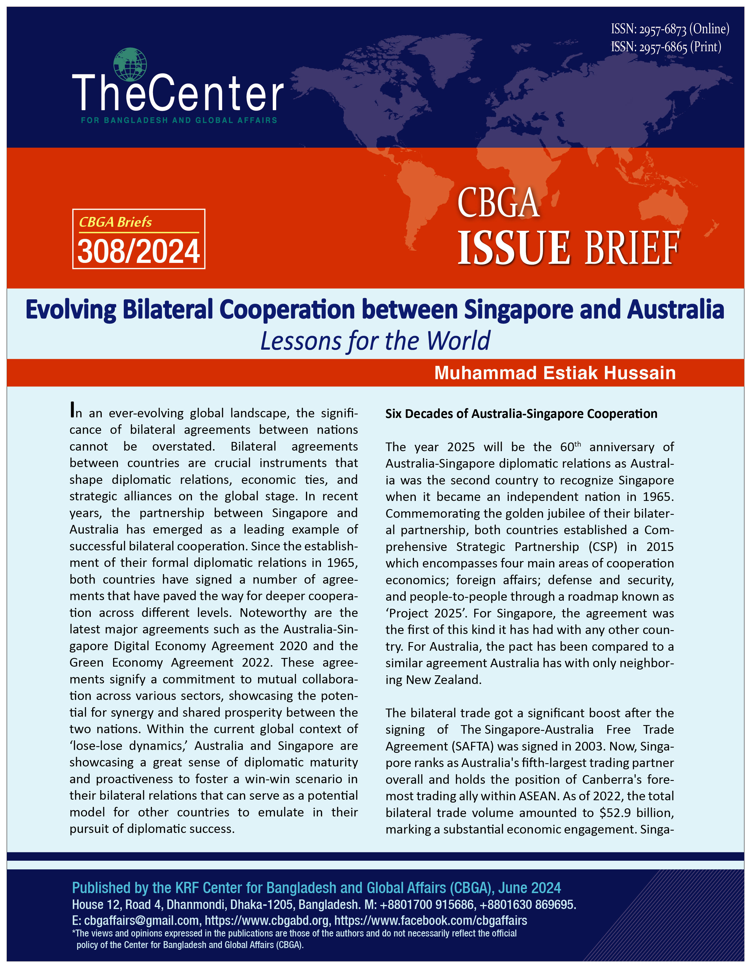 In an ever-evolving global landscape, the significance of bilateral agreements between nations cannot be overstated. Bilateral agreements between countries are crucial instruments that shape diplomatic relations, economic ties, and strategic alliances on the global stage. In recent years, the partnership between Singapore and Australia has emerged as a leading example of successful bilateral cooperation. Since the establishment of their formal diplomatic relations in 1965, both countries have signed a number of agreements that have paved the way for deeper cooperation across different levels. Noteworthy are the latest major agreements such as the Australia-Singapore Digital Economy Agreement 2020 and the Green Economy Agreement 2022. These agreements signify a commitment to mutual collaboration across various sectors, showcasing the potential for synergy and shared prosperity between the two nations. Within the current global context of ‘lose-lose dynamics,’ Australia and Singapore are showcasing a great sense of diplomatic maturity and proactiveness to foster a win-win scenario in their bilateral relations that can serve as a potential model for other countries to emulate in their pursuit of diplomatic success.