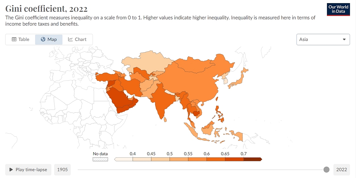 When we take these standard indicators based on the monetary aspects of life, South Asia has a moderate level of inequality. The ‘Gini Ratio’ of South Asian countries lies between 0.28 and 0.40, which is lower than that of other countries like China, South Africa, Mexico, etc.