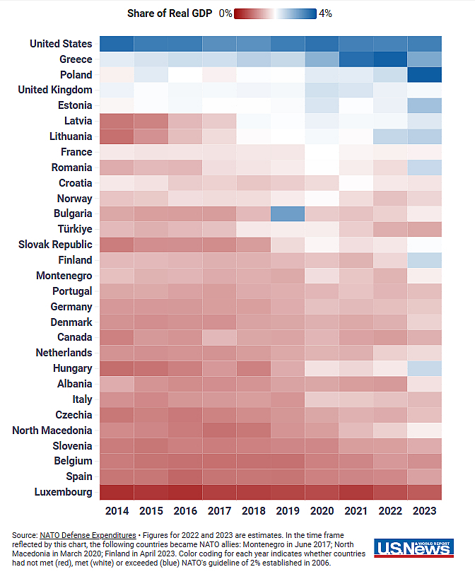 Source: https://www.usnews.com/news/best-countries/articles/2024-02-12/only-35-of-nato-countries-meet-the-groups-defense-spending-target#:~:text=NATO%20is%20funded%20by%20its,and%20supplied%20by%20member%20countries.