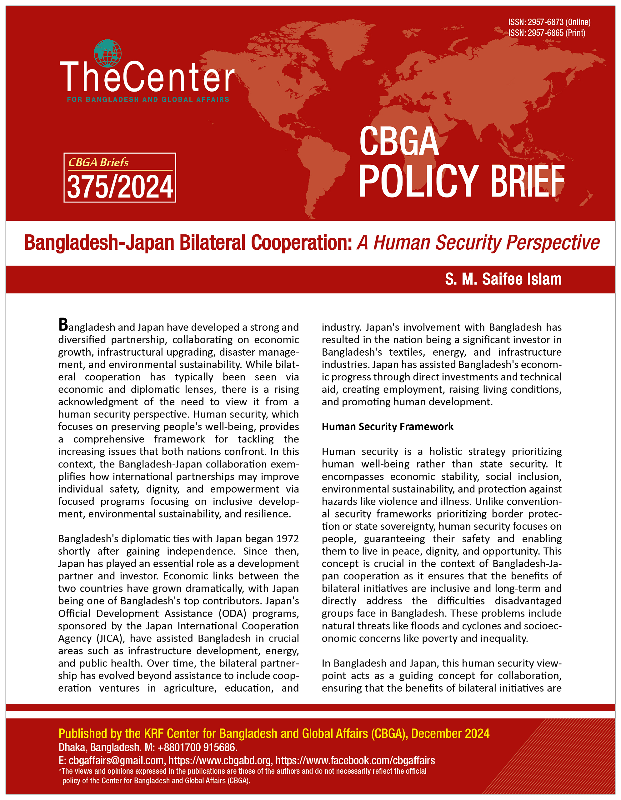 Bangladesh and Japan have developed a strong and diversified partnership, collaborating on economic growth, infrastructural upgrading, disaster management, and environmental sustainability. While bilateral cooperation has typically been seen via economic and diplomatic lenses, there is a rising acknowledgment of the need to view it from a human security perspective. Human security, which focuses on preserving people’s well-being, provides a comprehensive framework for tackling the increasing issues that both nations confront. In this context, the Bangladesh-Japan collaboration exemplifies how international partnerships may improve individual safety, dignity, and empowerment via focused programs focusing on inclusive development, environmental sustainability, and resilience.