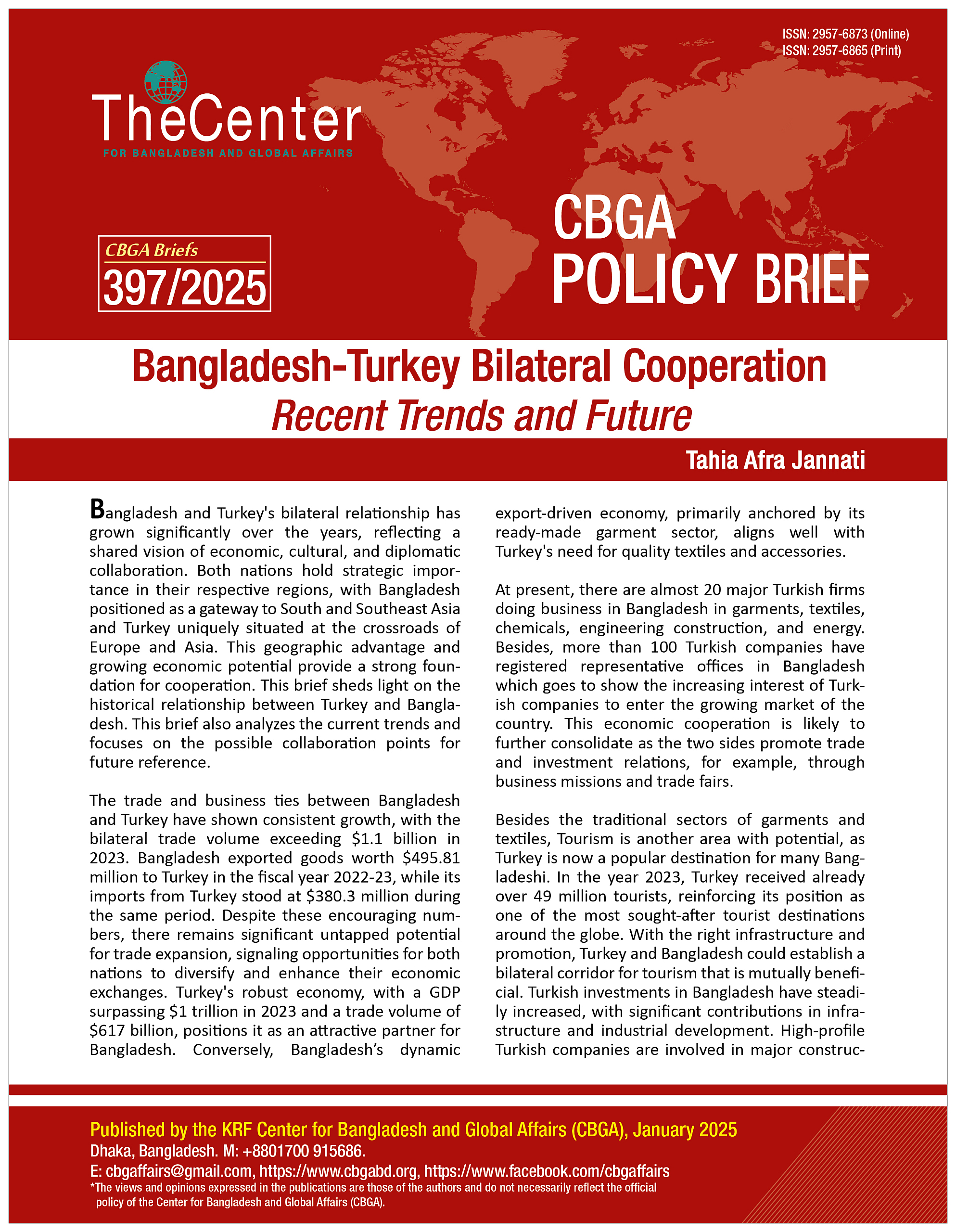 Bangladesh and Turkey’s bilateral relationship has grown significantly over the years, reflecting a shared vision of economic, cultural, and diplomatic collaboration. Both nations hold strategic importance in their respective regions, with Bangladesh positioned as a gateway to South and Southeast Asia and Turkey uniquely situated at the crossroads of Europe and Asia. This geographic advantage and growing economic potential provide a strong foundation for cooperation. This brief sheds light on the historical relationship between Turkey and Bangladesh. This brief also analyzes the current trends and focuses on the possible collaboration points for future reference.