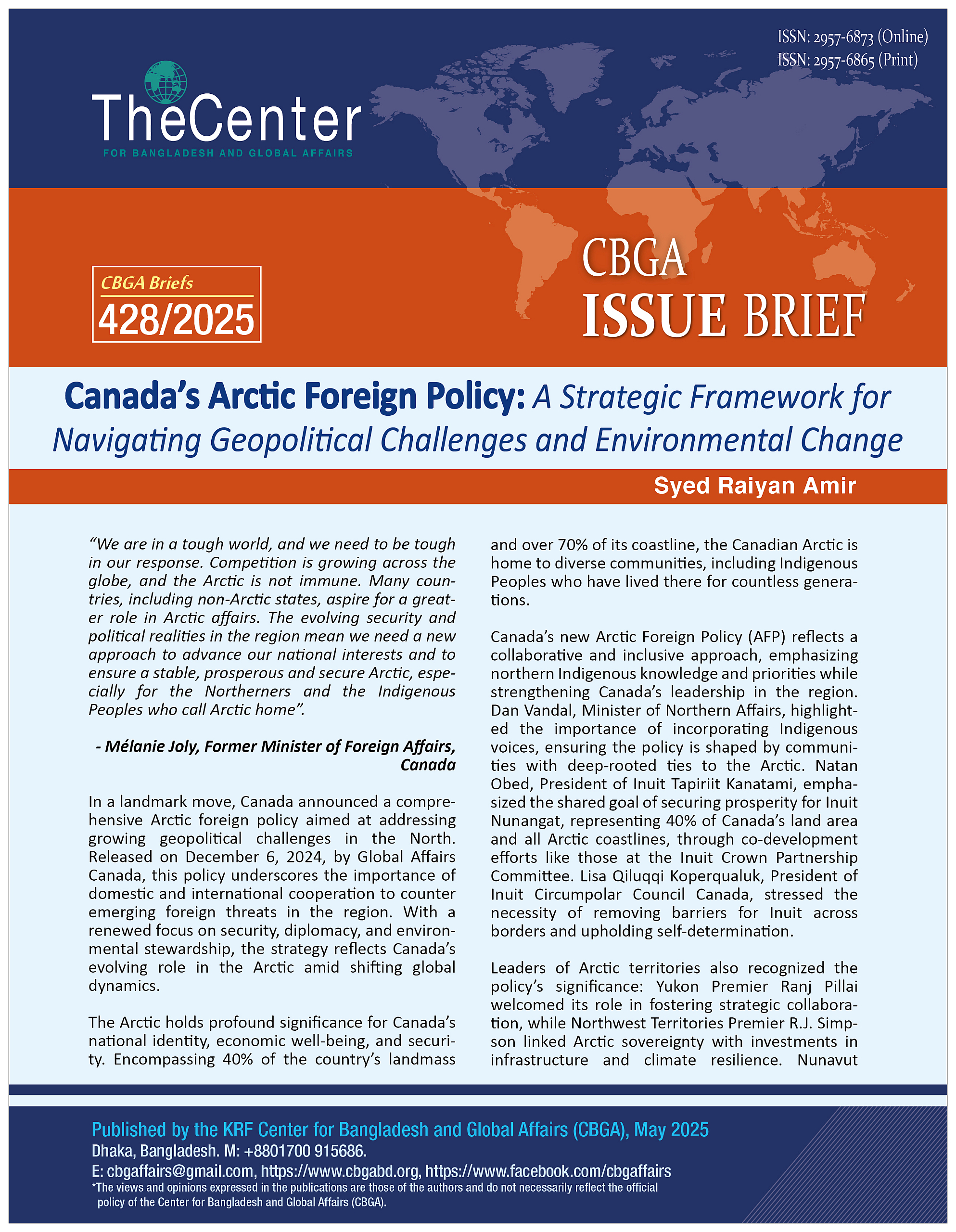 The Arctic Foreign Policy (AFP) serves as a comprehensive framework for Canada’s Arctic engagement, enhancing diplomatic presence and partnerships to meet current needs while remaining adaptable to future challenges. Building on the 2019 Arctic and Northern Policy Framework (ANPF), the AFP focuses on safeguarding sovereignty, advancing national interests, and fostering a stable, secure, and prosperous Arctic aligned with a shared regional vision. Structured around four pillars—asserting sovereignty, advancing pragmatic diplomacy, leading in Arctic governance and multilateral issues, and adopting an inclusive approach—the policy aims to strengthen the Arctic’s resilience against emerging threats while prioritizing the needs of territorial governments, provinces, and Indigenous communities.